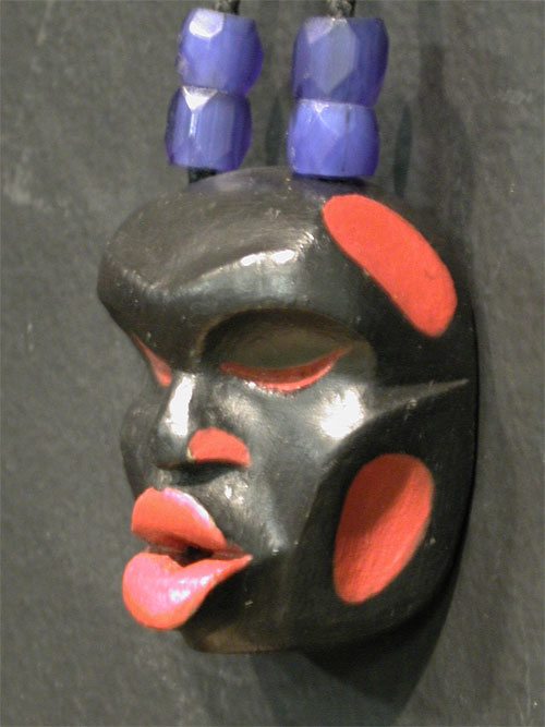 Native Miniture's - Wildwomen Necklace by Ozzie Wadhams Miniature Wildwomen necklace 1 3/4 inch height , 1 1/2 inch width , 1 inch depth fully carved and painted red cedar with trade beads necklace SOLD